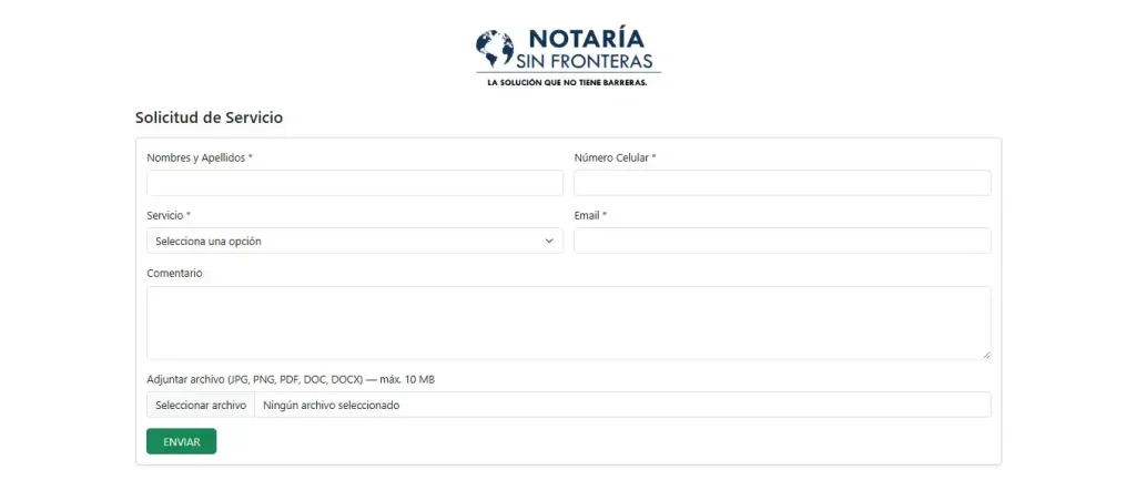 Complete el formulario con la información solicitada: nombres y apellidos, número de celular, correo electrónico y el servicio que desea solicitar.