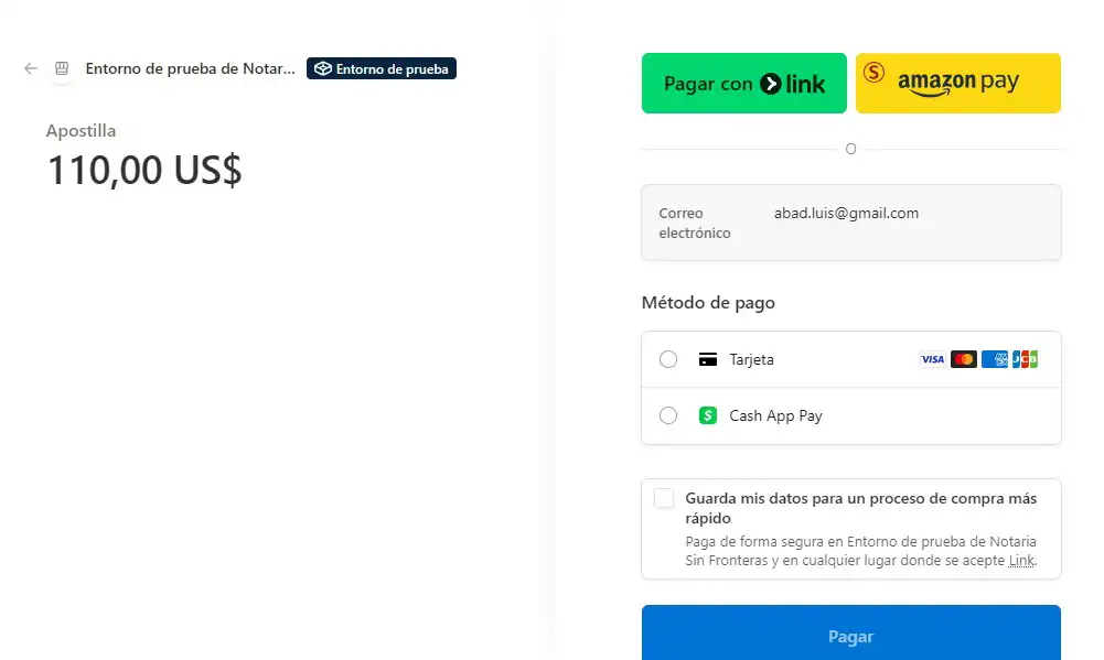 El siguiente paso consiste en realizar el pago de su servicio. Puede hacerlo con tarjeta de crédito o débito, Amazon Pay o mediante un enlace de pago.