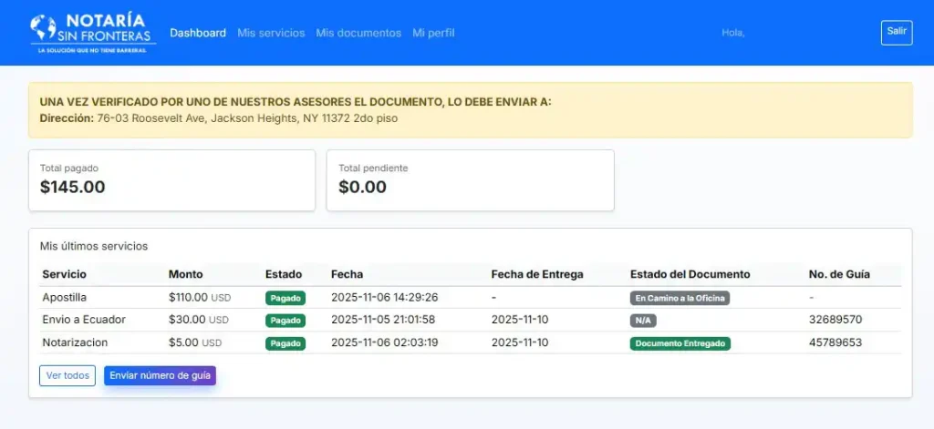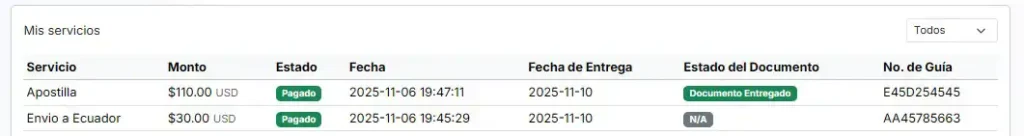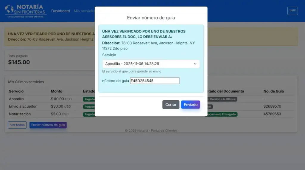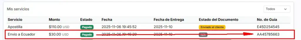 Una vez procesado el pago, se enviará al cliente el número de guía para el respectivo seguimiento. Además, el estado del documento será actualizado y notificado al cliente.