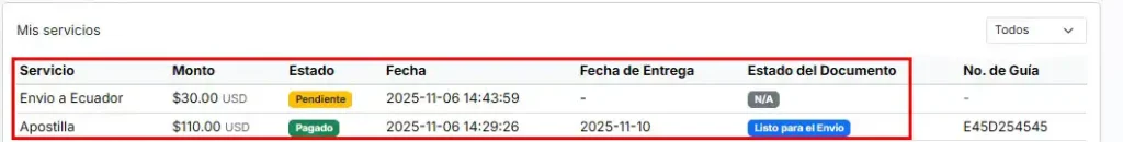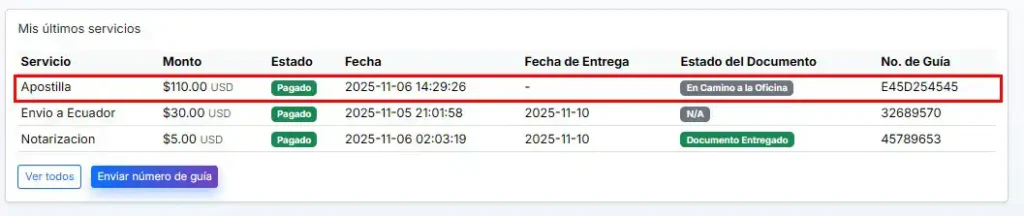 También puede seleccionar su servicio y agregar el número de guía o tracking correspondiente al envío de su documentación.