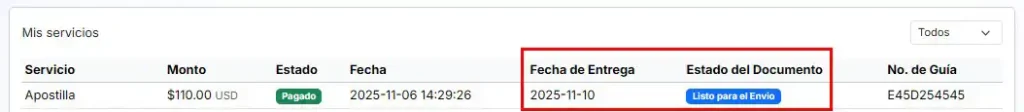 En esta etapa, cuando el documento esté listo, podrá retirarlo personalmente en nuestras oficinas o solicitar el envío a domicilio, servicio que tiene un costo adicional.
